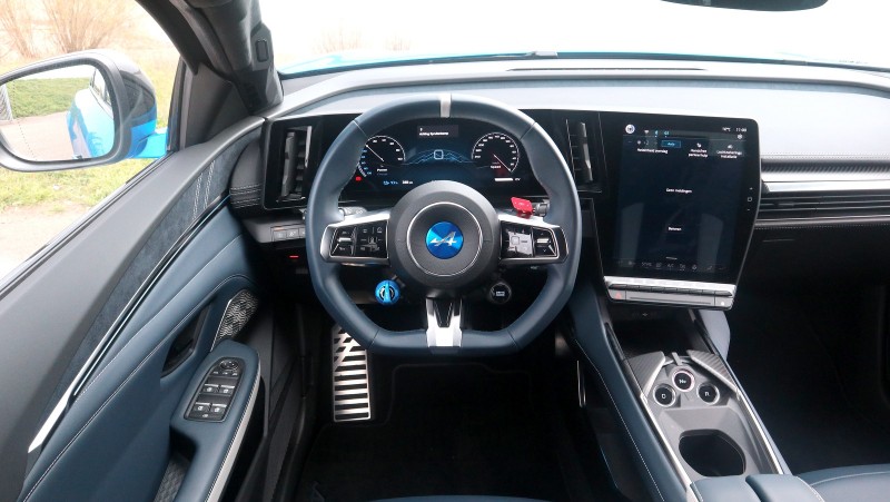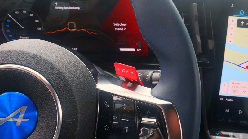 Blikvanger is het stuur, waar Alpine zichtbaar extra werk van heeft gemaakt. Het is verwarmbaar, bekleed met blauw nappaleder en heeft een afgeplatte onderzijde. Interessanter wordt het met de bediening: naast een prominente knop voor de rijmodi zitten er twee aluminium regelaars die duidelijk naar de motorsport verwijzen. De blauwe 'RCH'-draaiknop bepaalt de mate van regeneratie, tot en met one-pedal driving. De rode 'OV'-knop levert tijdelijk extra vermogen voor inhaalacties en is gekoppeld aan launch control. Origineel en onderscheidend, al zal het in de praktijk vooral dienen om indruk te maken op de passagiers.